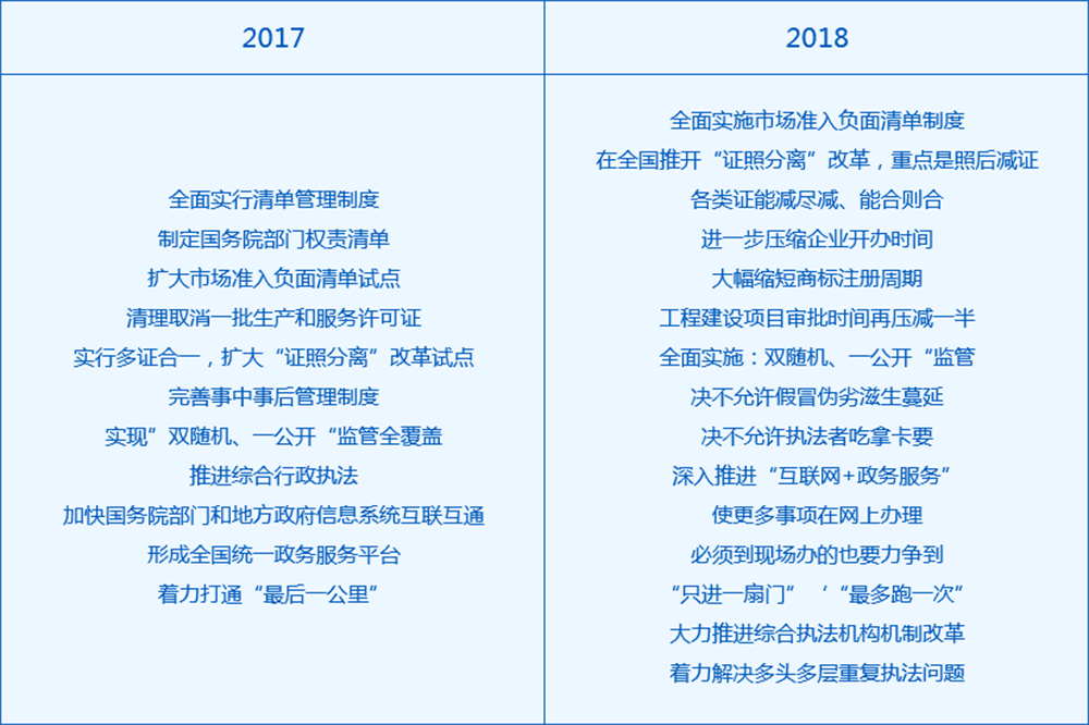 从2014年李克强总理作政府工作报告开始,就能探出国家对优化营商环境、行政审批制度改革的重视,而在2014年——2016年的一大聚焦点在权责清单制度的设立、公布、全面推进。到2017年,突出了很多新重点,并延续到了2018年,我们来看这两年政府工作报告关于“互联网+政务服务”部分内容的对比: 。