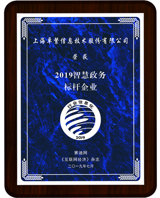 上海卓繁信息技术股份有限公司凭借不断突破的创新精神、强劲的发展势头和雄厚的技术实力,在“2019行业信息化技术创新发展峰会”中荣膺“2019智慧政务标杆企业”奖和“2019AI政务服务自助终端最佳产品”奖。