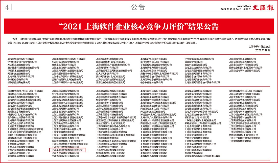 了评价,并结合专家评议,产生了2021上海软件企业核心竞争力评价结果。相关荣誉结果在上海市软件行业协会官网发布,并刊登于《文汇报》。