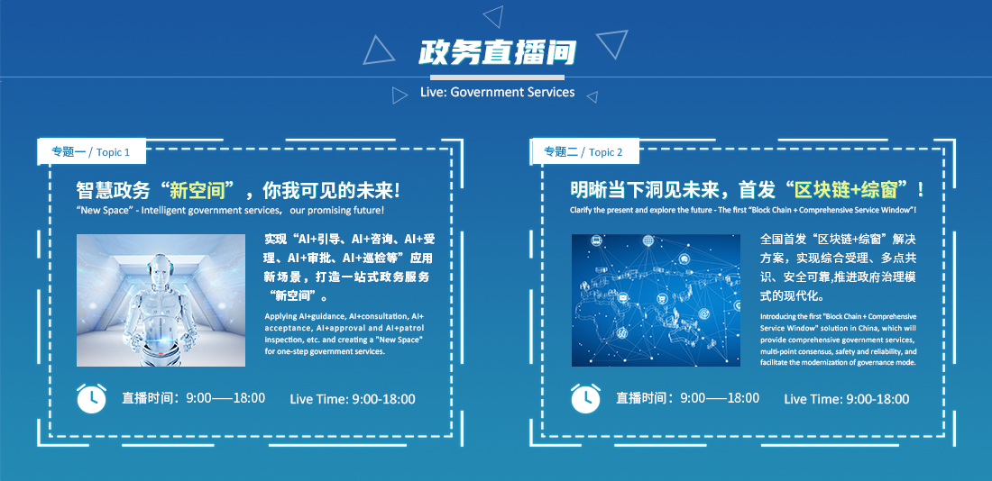 《政务直播间》,分别以《智慧政务“新空间”,你我可见的未来》、《明晰当下洞见未来,首发“区块链+综窗”》为直播主题,进行专题演说。