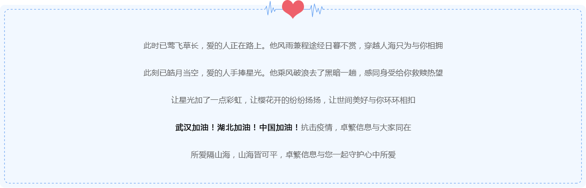 手足情深,守望相助。前方,逆行者们勇毅向前抢救生命;后方,无数个“卓繁信息”汇聚一起,集聚各方能力,保护生命。在全民抗击疫情的特殊时期,一切力量都为抗击疫情,为呼吸自由而努力。
