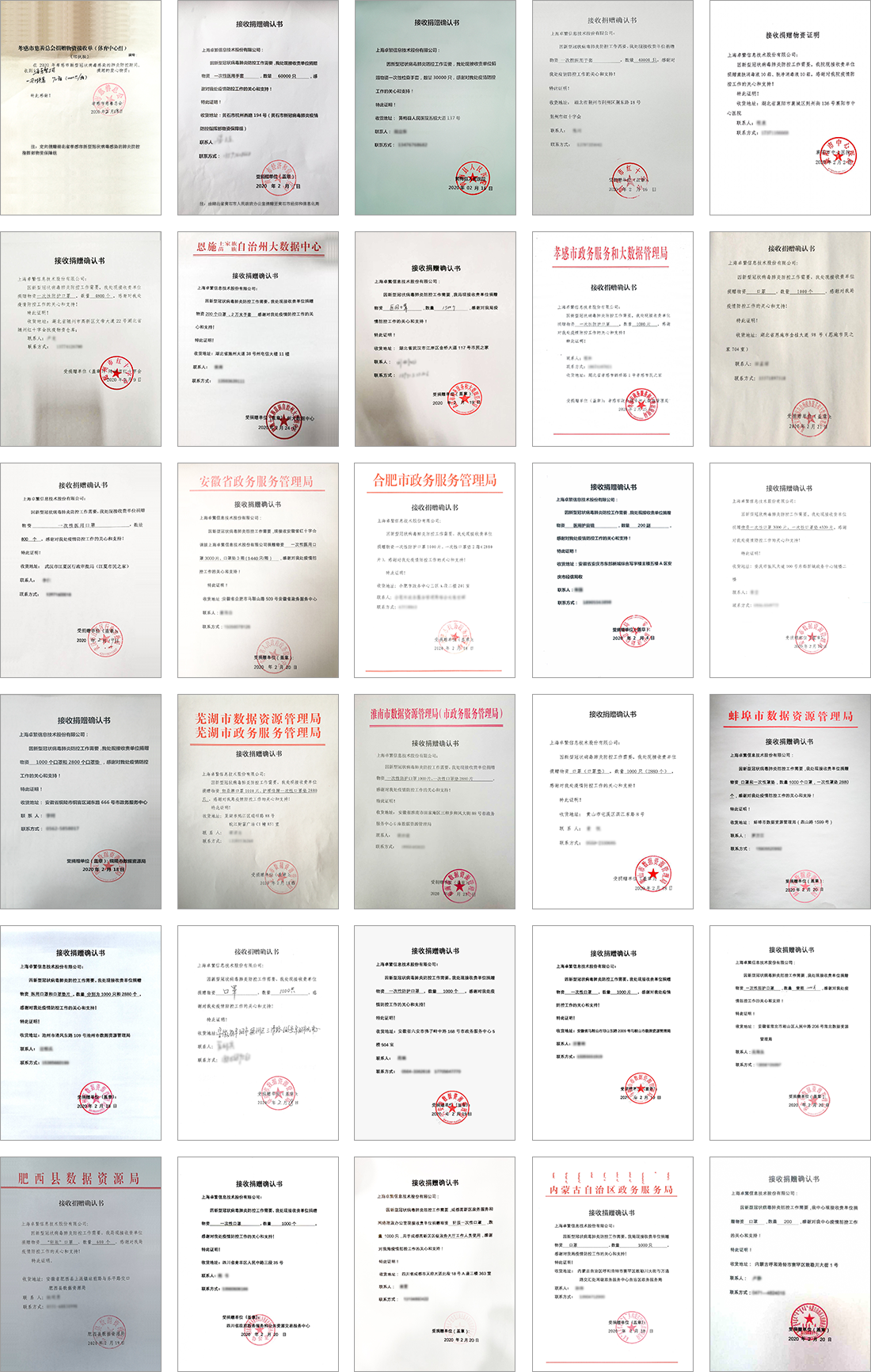 在给社会各界爱心和温暖的同时,卓繁信息还陆续收到受捐单位的捐赠确认书。