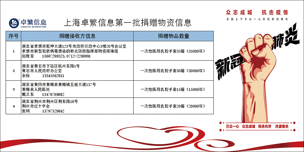 卓繁信息积极与公益组织及机构联系商议公益事宜,除组织公司内部募捐外,还将以公司名义提供支援。此次捐赠资金共计22万元,将全部用于湖北省及周边情况严重区域抗击疫情,由专门小组根据当前紧缺医疗物资的情况进行采购并分批次捐赠到相关机构。